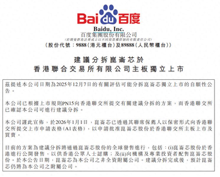 目前的方案为:建议分拆将通过昆仑芯股份的全球发售进行,包括:(i)昆仑芯股份于香港进行公开发售,以供香港公众人士认购;及(ii)向机构及专业投资者配售昆仑芯股份。