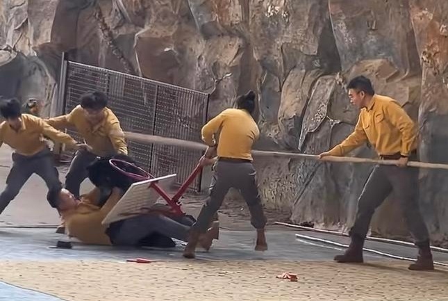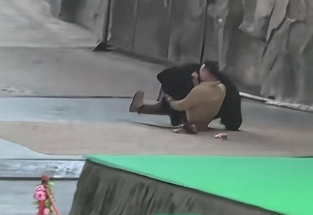 黑熊在表演时突然攻击饲养员(网友视频截图)