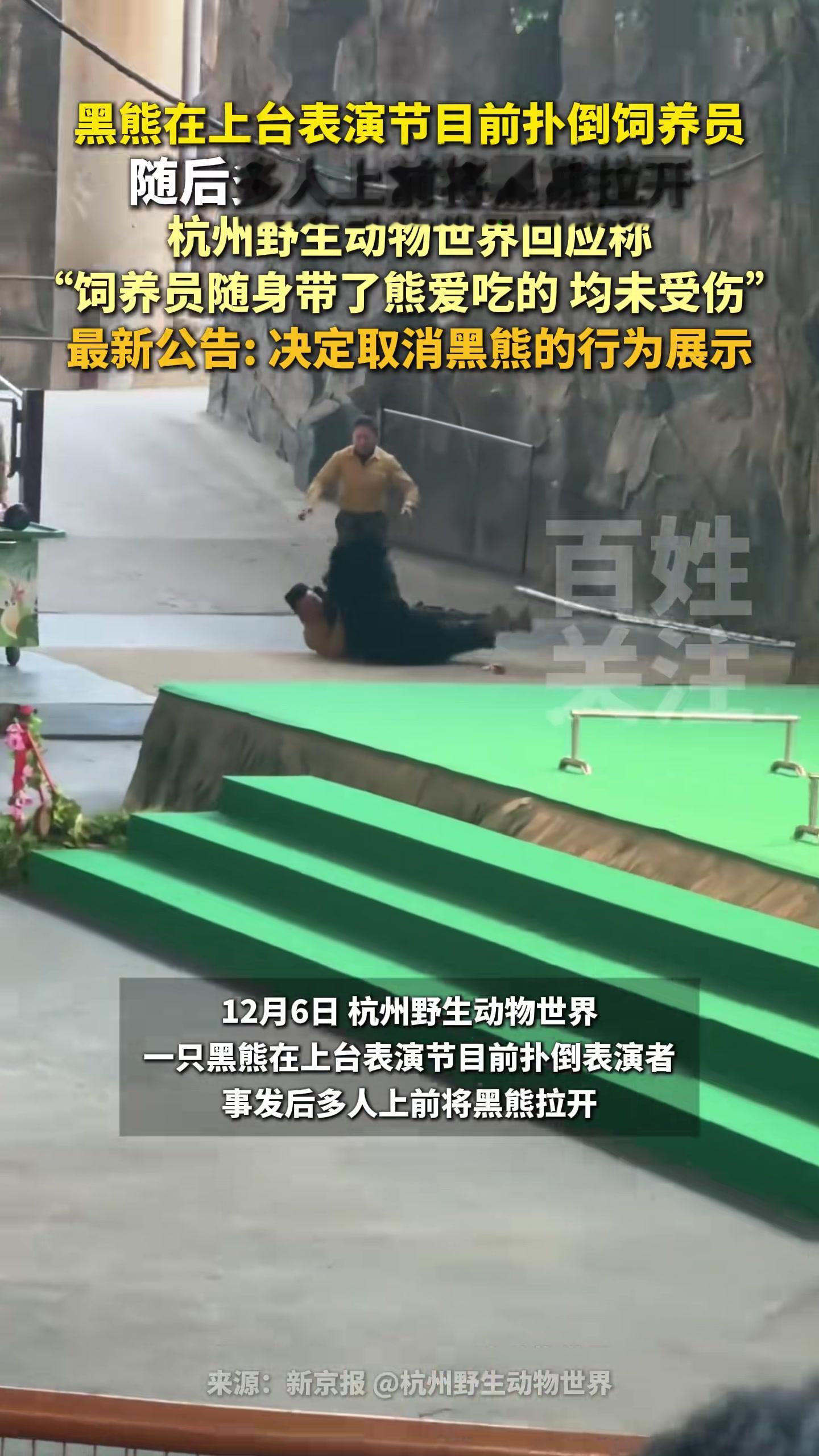 此前据媒体报道,12月6日,多位网友发视频称,杭州野生动物世界一只黑熊在表演过程中,突然攻击饲养员两次。