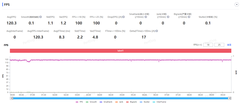 在《王者荣耀》中,我们将帧率、分辨率超高的模式下,游戏平均帧率为120.3 FPS,画面整体也维持在120帧左右,非常稳定。