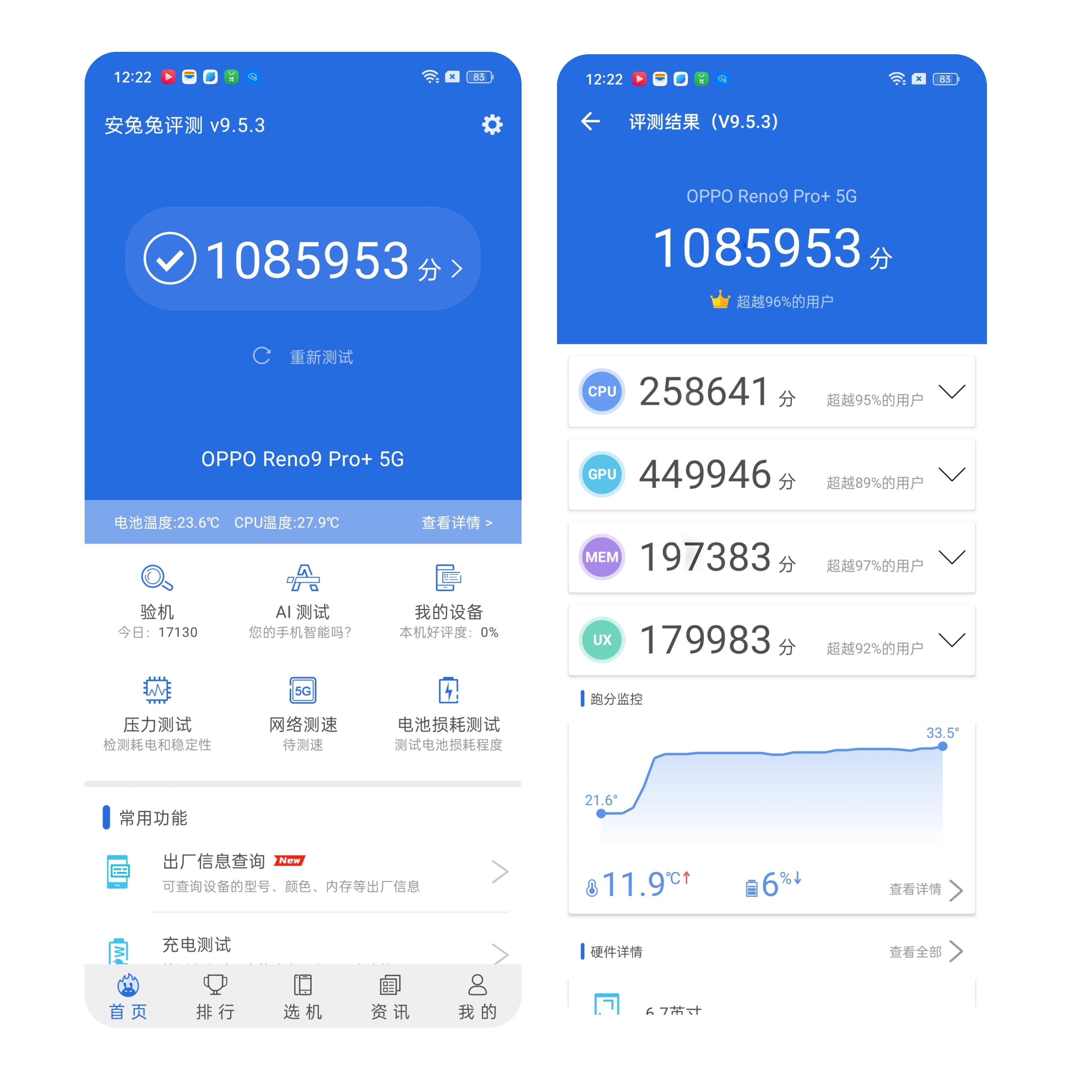 测试期间,手机温度从21.6℃升级到33.5℃,很明显还留有余力。