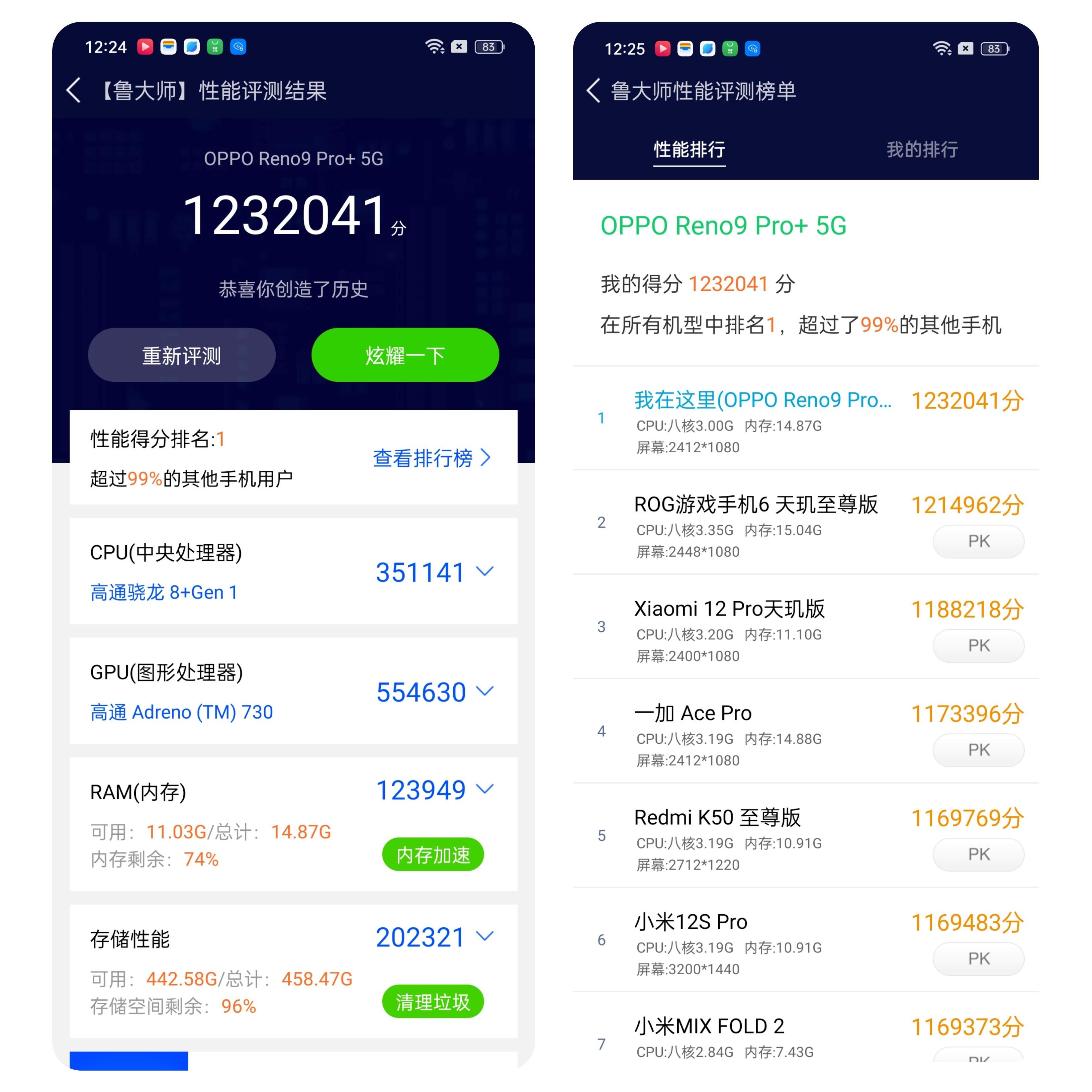 在鲁大师测试中,OPPO Reno 9 Pro+跑出了1232041的分数,并且它在所有参与鲁大师测试的机型中排名第一。