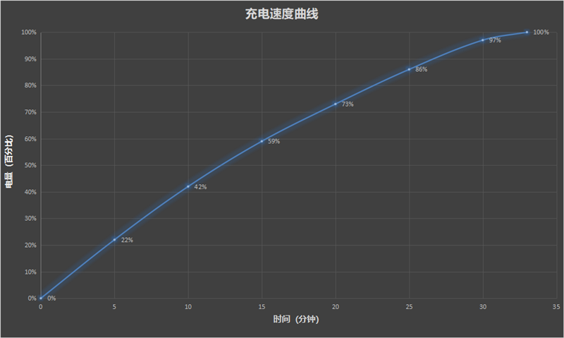 在实际充电测试中,该机5分钟便可充入22%,15分钟可充满59%,完全充满也仅需33分钟,与官方的数据基本一致,能够让我们在手机没电的情况下,快速“满血复活”。