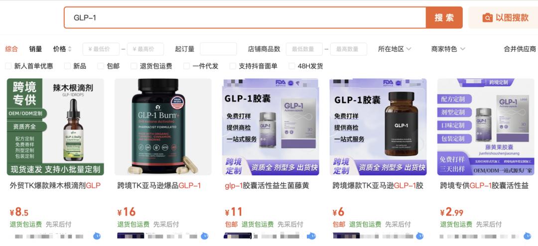 ● 在某B2B平台搜索“GLP-1”,已有商家提供制药一站式服务。图源:网络
