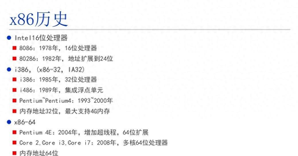 X86处理器从最早的8086到现在发展出好多版本,32位、64位的区别很大。早期的CPU只有几个寄存器,后来越做越大,现在的64位处理器能支持256TB内存,比我家电脑大太多了。那些寄存器像仓库货架,专门放数据用的,像EAX这种还能分块操作,前面放数字后面留空。不过有些寄存器一般人碰不到,比如控制程序跳转的IP,感觉像是CPU的操作系统。