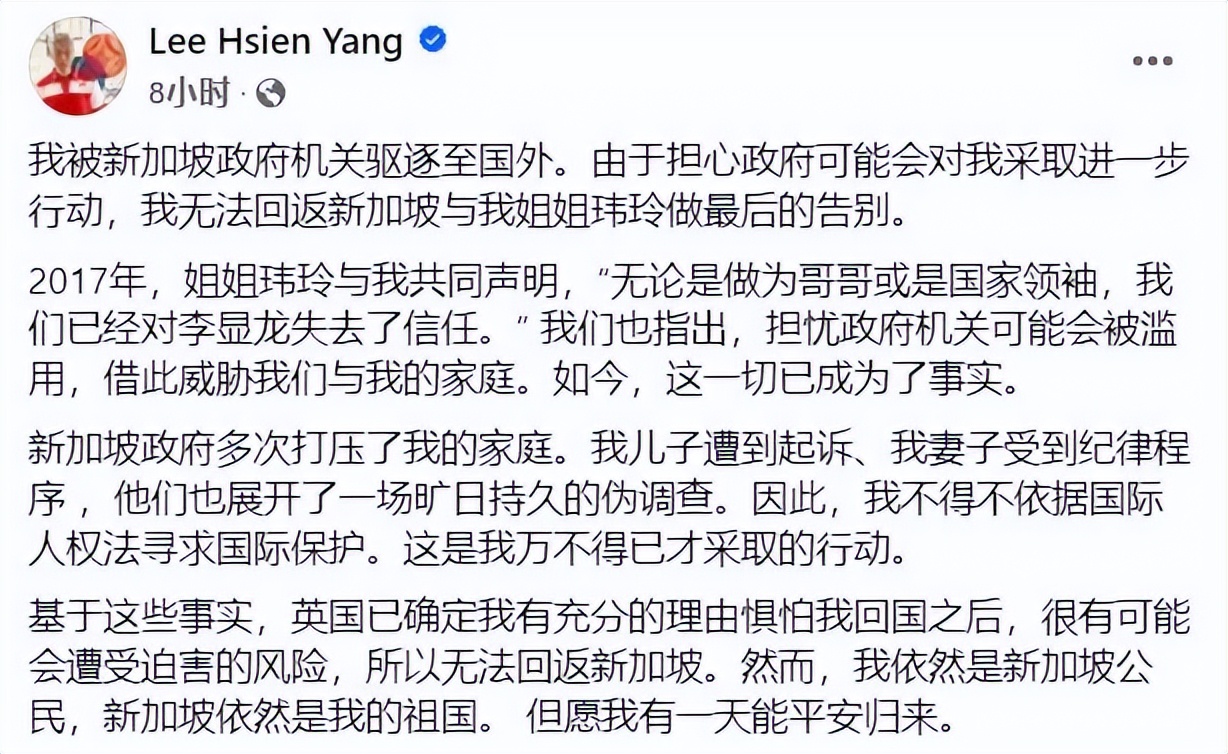 2024年10月22日,新加坡开国总理李光耀次子李显扬在社交媒体上发文称,其向英国申请的政治难民身份已获批准。