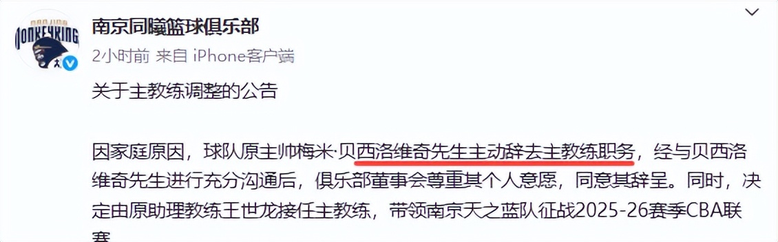 南京同曦篮球俱乐部官宣换帅,因家庭原因,贝西洛维奇主动辞去主教练职务,决定由原助理教练王世龙接任主教练,带领南京天之蓝队征战2025-26赛季CBA联赛。