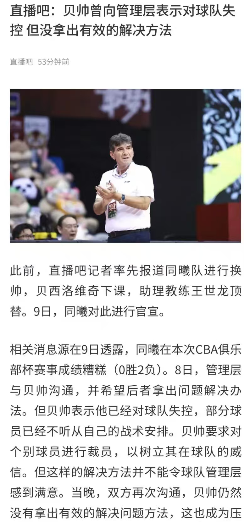 据“直播吧”爆料,同曦在本次CBA俱乐部杯赛事成绩糟糕(0胜2负)。8日,管理层与贝帅沟通,并希望后者拿出问题解决办法。但贝帅表示他已经对球队失控,部分球员已经不听从自己的战术安排。贝帅要求对个别球员进行裁员,以树立其在球队的威信。但这样的解决方法并不能令球队管理层感到满意。当晚,双方再次沟通,贝帅仍然没有拿出有效的解决问题方法,这也成为压死骆驼的最后一根稻草。