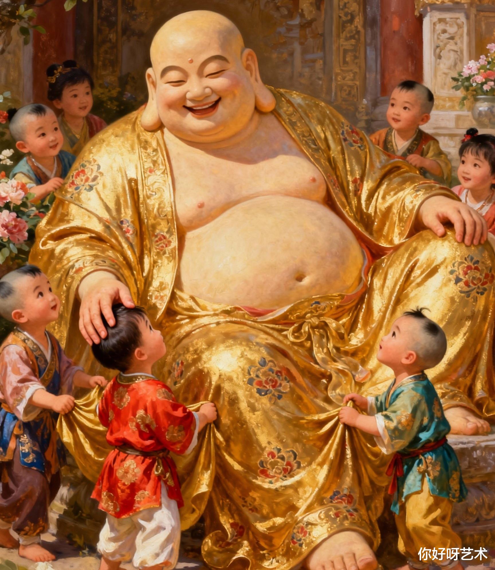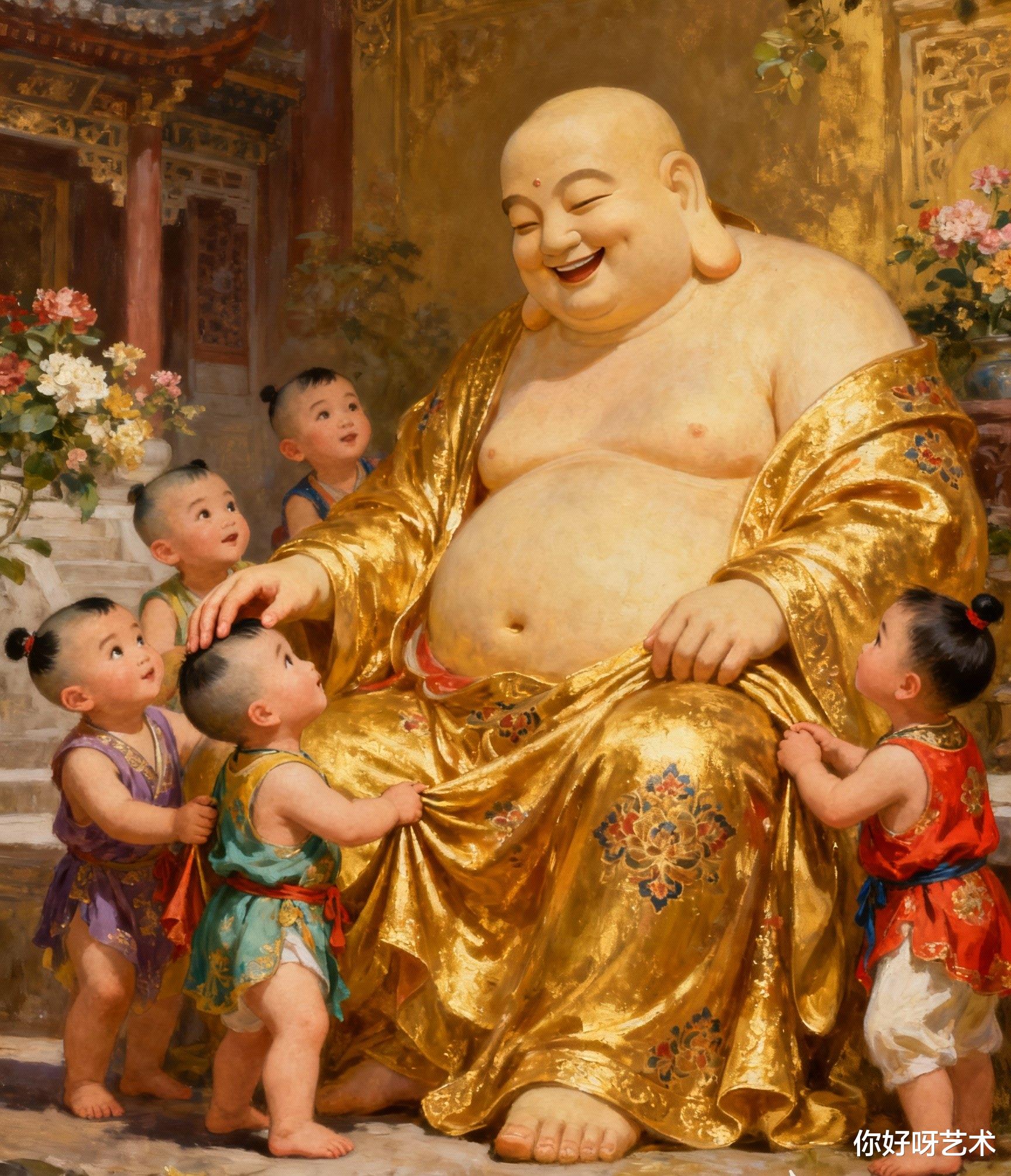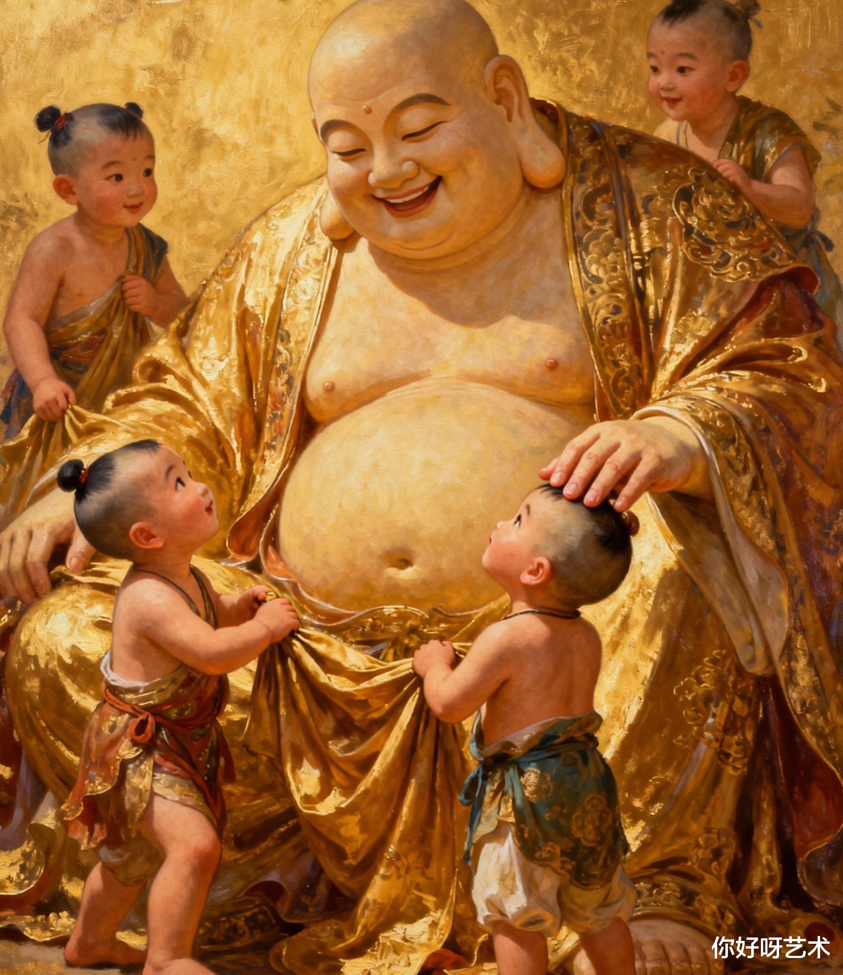 从画面的整体布局来看,弥勒佛居于中心位置,这是一种极具视觉引导性的构图方式。他那庞大而圆润的身躯几乎占据了画面的主要部分,给人一种充实且安定的感觉。画家似乎是想通过这种构图,传达出弥勒佛在人们心中那种举足轻重的地位,他就像一座宁静的岛屿,屹立于尘世的喧嚣之上。