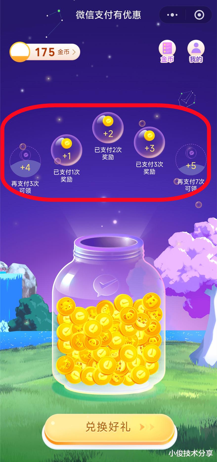 重点来了哈!你看,进入“支付有优惠”后,首先映入我们眼帘的就是一排跳到的气泡,你会发现咱们点一下,哎就可以领取一个金币,现在大家都清楚了吧