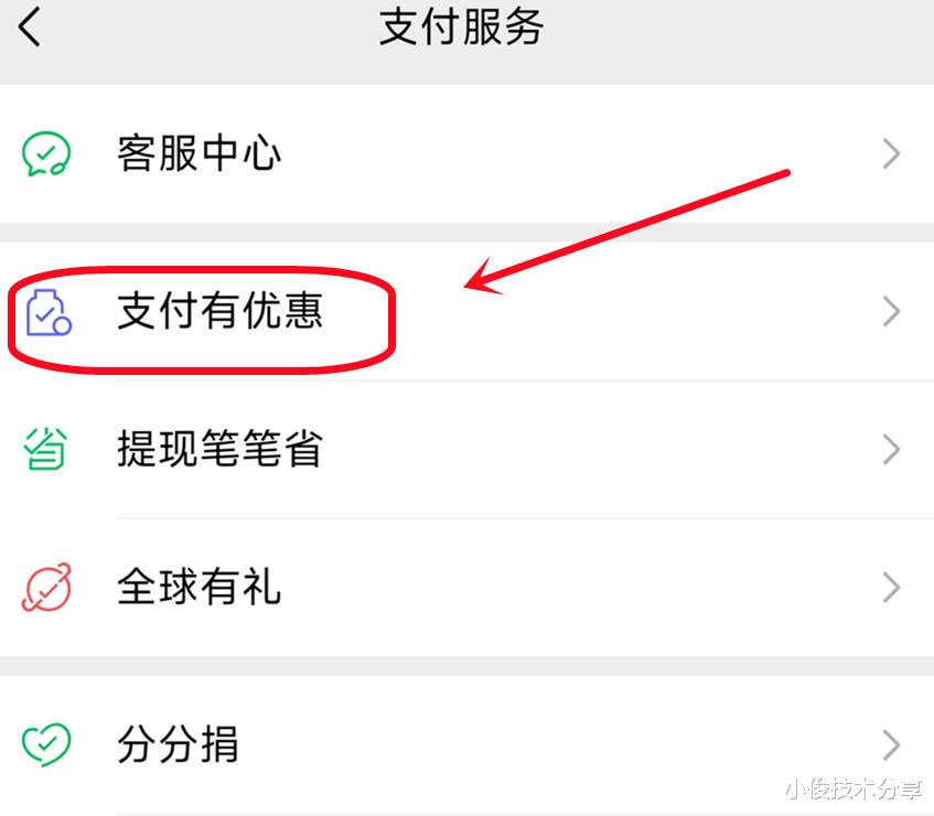 第三步,在支付服务页面里,大家把目光往下看,找到第二个【支付有优惠】,大家看到了吧,咱们点击支付有优惠,看看里面有什么宝贝。