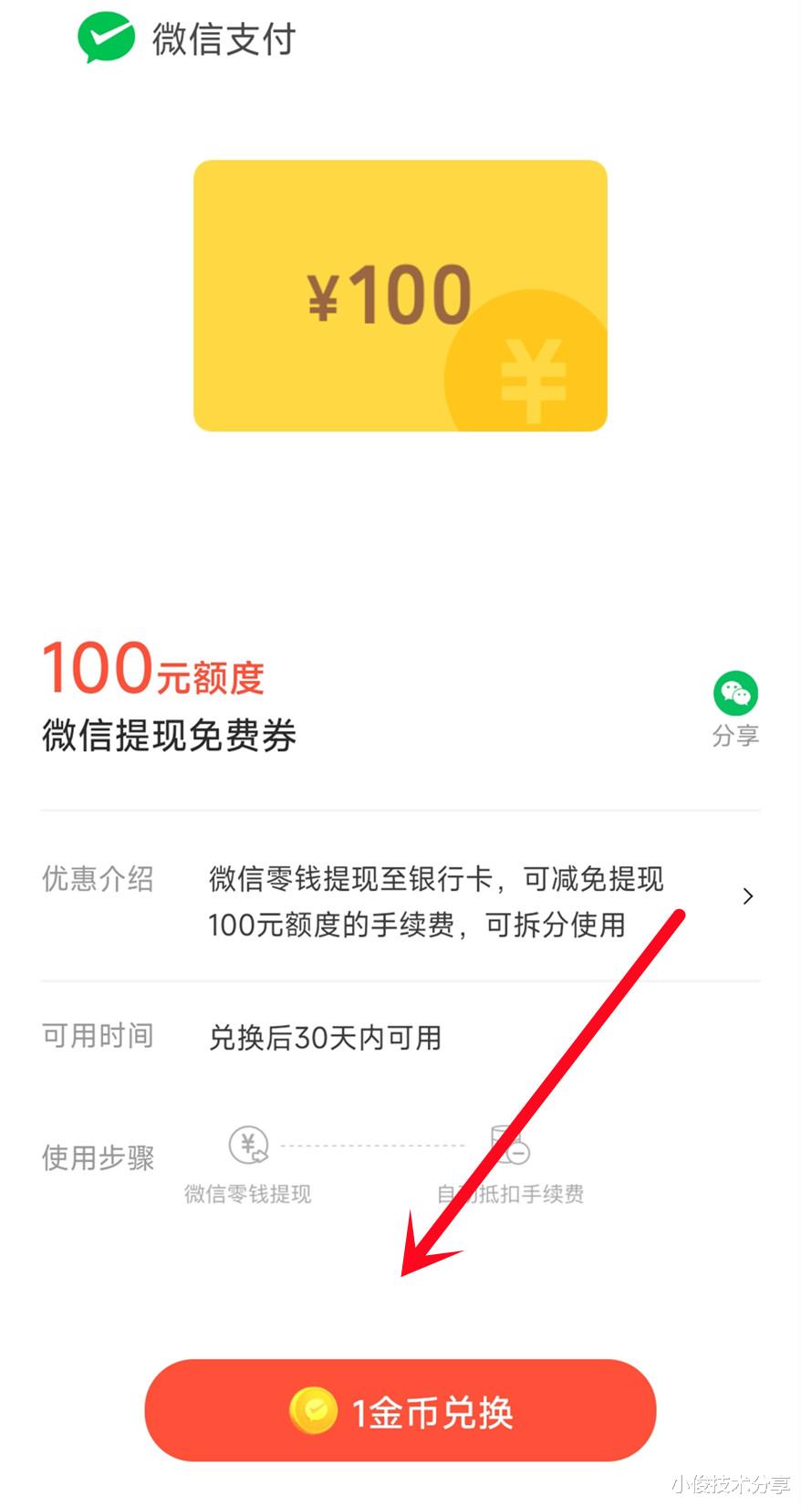 那我就点击100元额度的,然后点一下1金币兑换,这样就兑换成功了!
