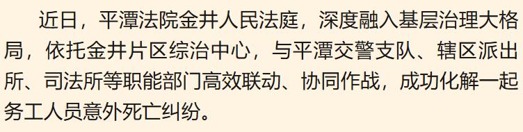 面对这一突发性、易激化的矛盾纠纷苗头,金井人民法庭并未坐等案件进入诉讼程序,而是主动向前延伸司法职能,第一时间启动“人民法庭+综治中心”联动调解机制。金井片区综治中心在此刻发挥了不可替代的“中枢平台”作用,在综治中心的调解室内,迅速组织了一场由金井人民法庭、平潭交警支队、辖区派出所、司法所共同参与,贾一的主要亲属与用工单位代表到场的联合调解会。