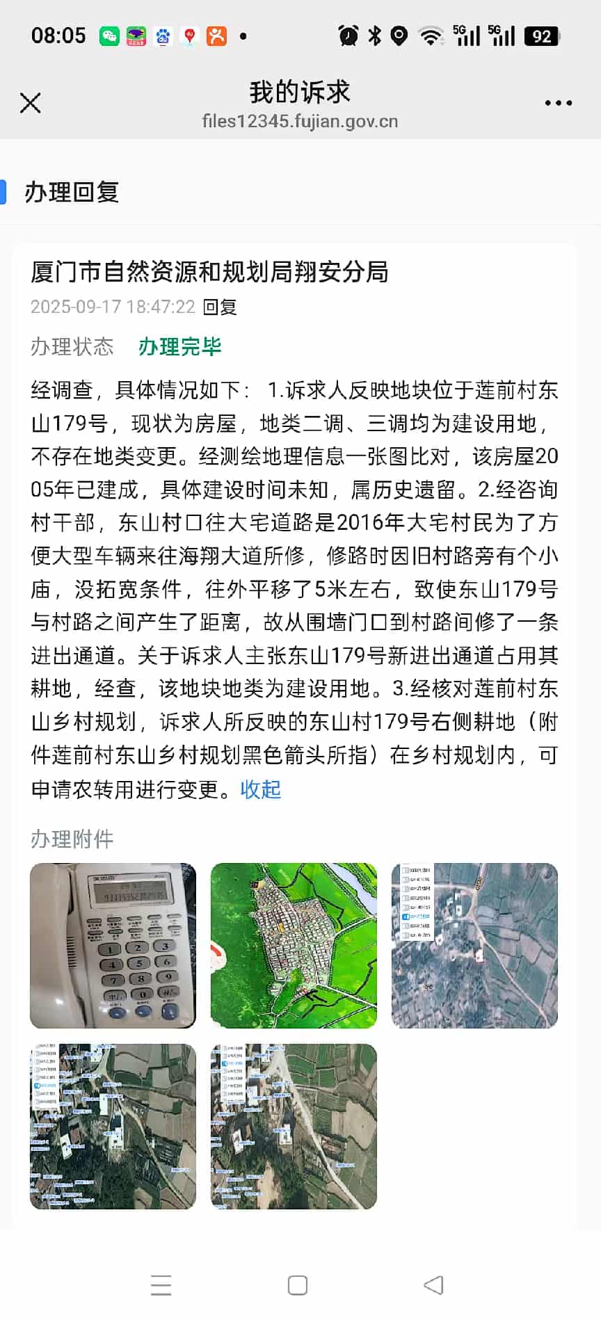 2026年4月2日: 针对城镇户口人员占用耕地违建、土地性质存疑以及“二违”建筑迟迟未处理的情况,王连宏再次提交诉求(受理编号:XM26040220684)。此事被转交至翔安区执法局及自然资源和规划局翔安分局处理,预计完成时间为4月17日。