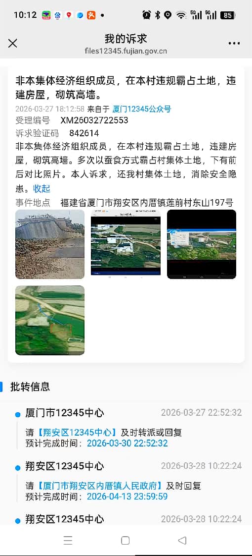2026年3月27日: 王连宏首次通过平台反映了非本村成员占用土地、违建以及砌高墙存在安全隐患的问题(受理编号:XM26032722553)。该事项随后被转办至内厝镇人民政府,预计完成时间为4月13日。
