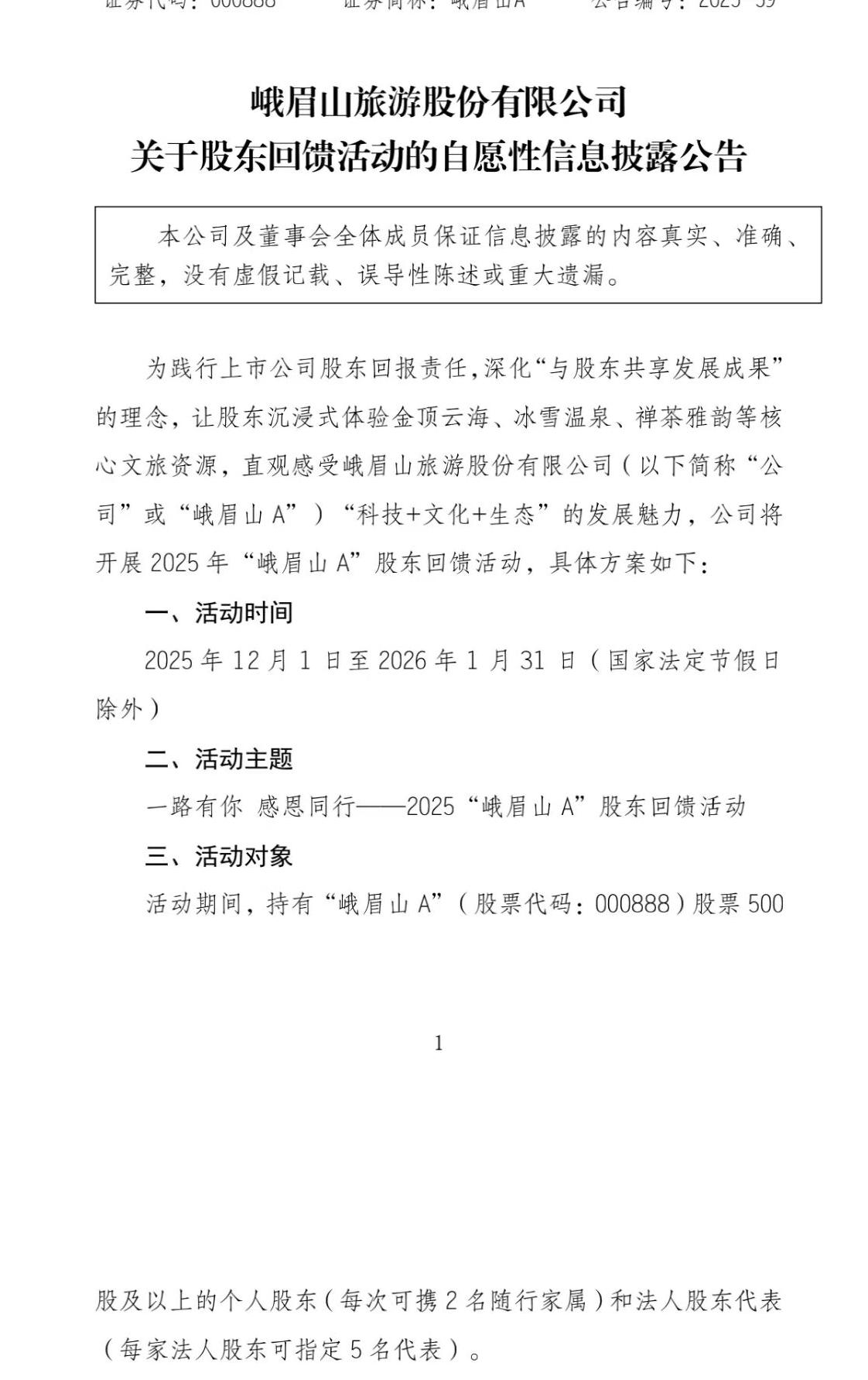2025年11月28日,峨眉山旅游股份有限公司发布的一则股东福利消息引发关注。