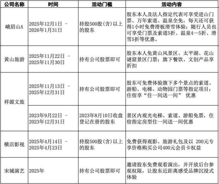 黄山旅游融合山水景观与徽文化,提供景区免票及文创、餐饮折扣;祥源文旅则聚焦“交通+住宿”,推出索道免费、酒店住一送一及特色体验活动,宋城演艺则以“免费观演+后台参观”增强股东品牌粘性。