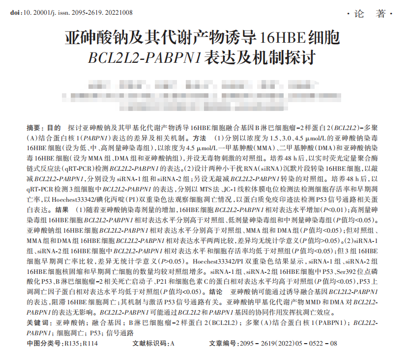 相关文献:亚砷酸钠及其代谢产物诱导16HBE细胞BCL2L2-PABPN1表达及机制探讨
