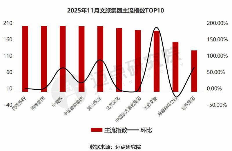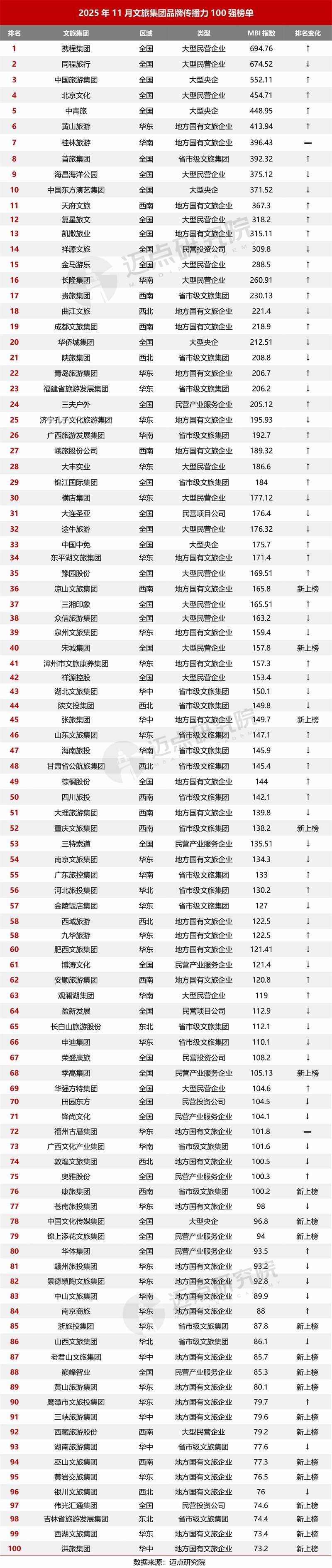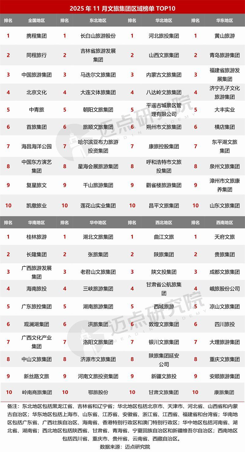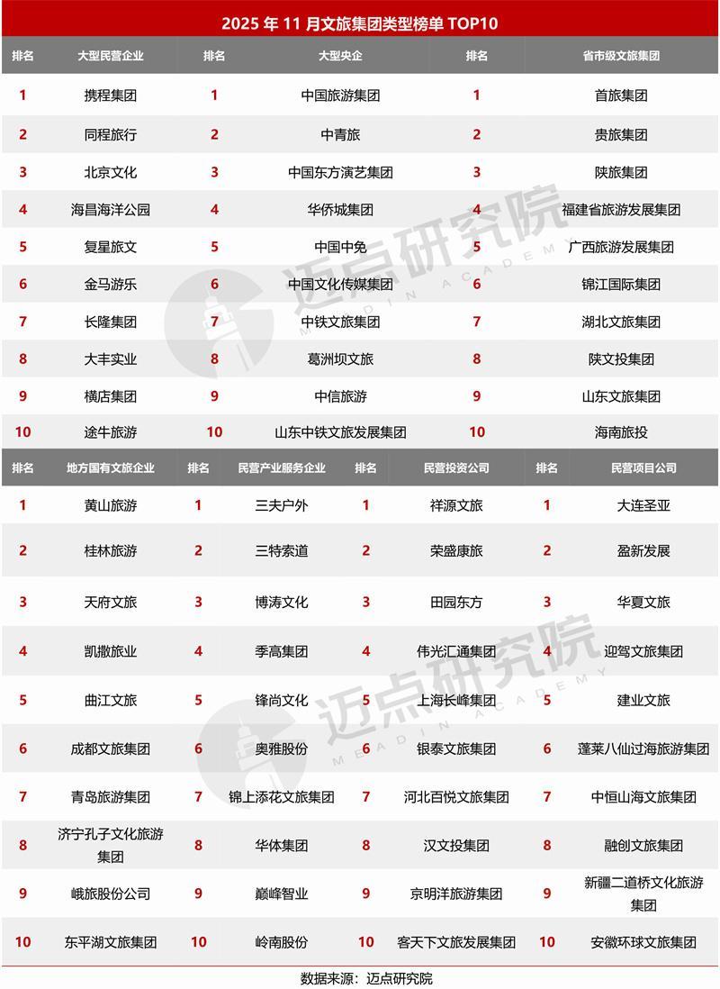 据迈点研究院数据显示:11月,携程集团、同程旅行、中国旅游集团、北京文化、中青旅、黄山旅游、桂林旅游、首旅集团、海昌海洋公园、中国东方演艺集团位列榜单前十。其中,百强榜单中共有38家文旅集团排名环比上升,40家文旅集团排名环比下降,20家文旅集团为新上榜,2家文旅集团排名保持不变。