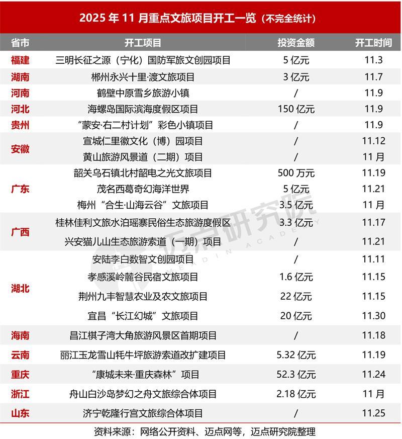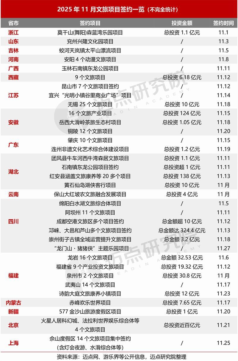 11月文旅项目动态观察:以四川邛崃、大邑、芦山三市县“共建巴蜀文旅走廊”为典型代表,总投资324.4亿元的文旅产业重大项目与重要交通项目进行集中签约,推进该区域文旅一体化发展;11月9日,总投资150亿元的海螺岛国际滨海度假区项目正式启动开工建设,该项目建设对提升秦皇岛市文化旅游品质、丰富旅游业态、带动旅游消费具有重要意义。