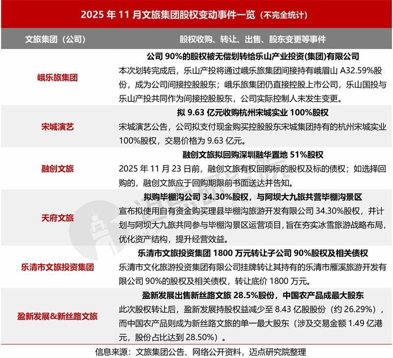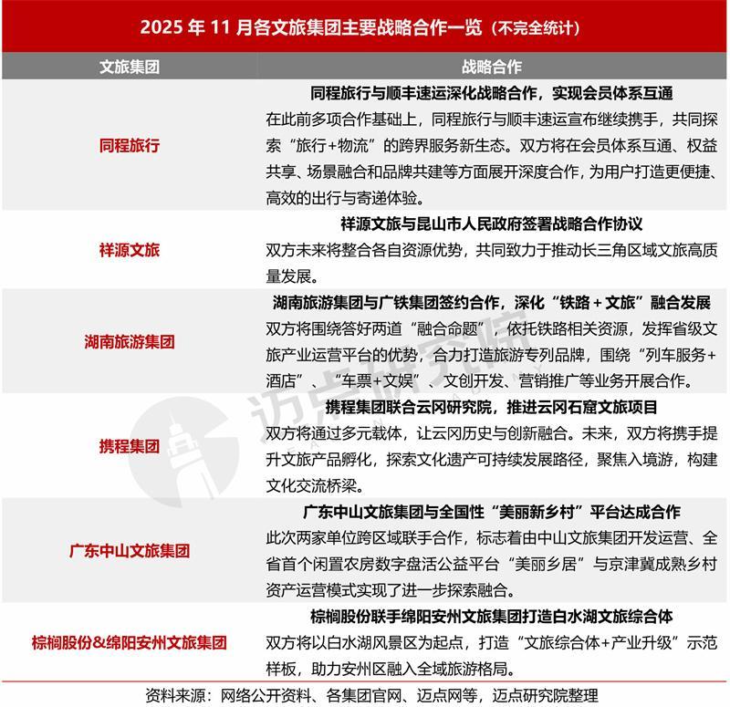 据不完全统计,2025年11月,共有6起文旅集团战略合作重大事件值得关注,涵盖“旅行+物流”、“铁路+文旅”、乡村资产盘活与运营、重点文旅项目建设、县域文旅系统合作、文化遗产旅游标杆打造等,利于发挥各方优势、盘活不同领域的存量资源、创新与优化文旅供给等。