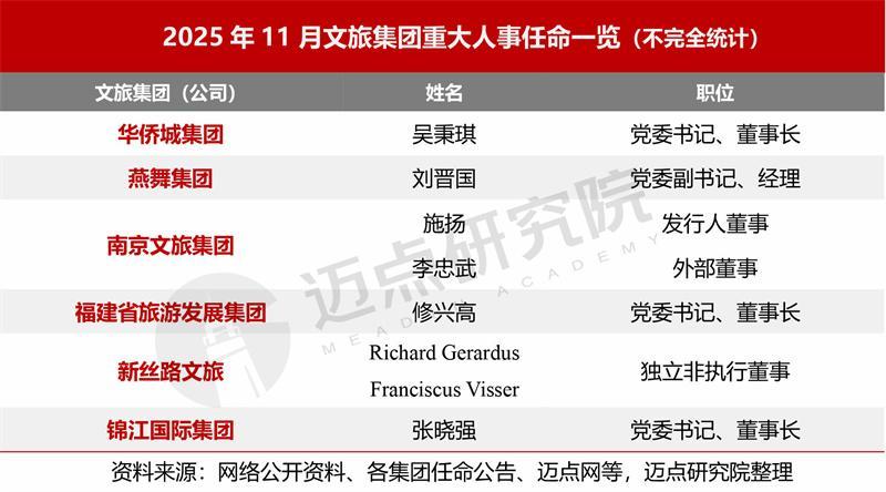 据不完全统计,2025年11月,涉及6个文旅集团的人事任命与高层变动。其中,吴秉琪任华侨城集团党委书记、董事长,张晓强正式任命为锦江国际集团党委书记并提名为董事长,
