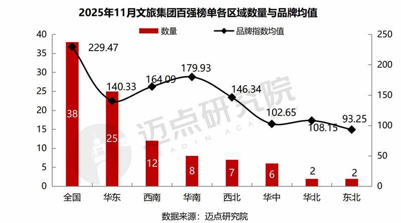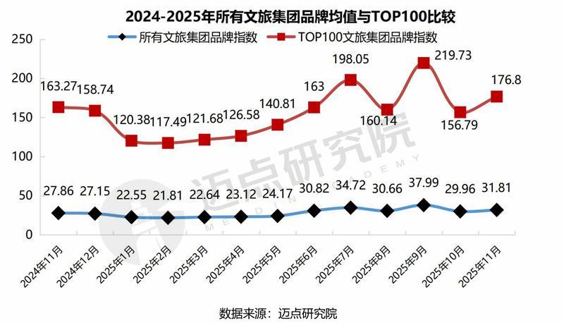 经迈点研究院监测数据显示,2025年11月,所有文旅集团的品牌指数值为31.81,同比上升14.18%,环比上升6.17%;TOP100文旅集团品牌指数值为176.8,同比增长8.29%,环比增长12.76%。可见,本月文旅集团品牌指数同比、环比均呈上升态势,彰显了各文旅集团加快资源整合、持续业态创新与深耕品牌培育的发展成效。