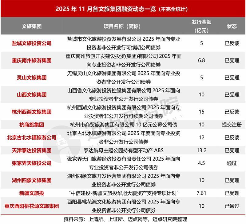 11月,以盐城文旅投资公司、重庆南州旅游集团、灵山文旅集团等十余家文旅集团为代表,各文旅集团发债频繁、融资进展加快,涉及金额约109亿元。从融资品种分析,泰达航母主题公园持有型不动产ABS、“中信建投-新疆文旅投华旭大厦资产支持专项计划”这两大ABS项目值得特别关注,前者为国内首单文旅类持有型不动产ABS(入池资产为4A级景区“基辅号”航母主题公园)、后者基础资产为华旭大厦租金收益。上述文旅ABS项目反映了文旅集团通过资产证券化盘活资产、拓宽融资渠道的创新探索,亦彰显了资本市场对优质文旅存量资产的价值认可。