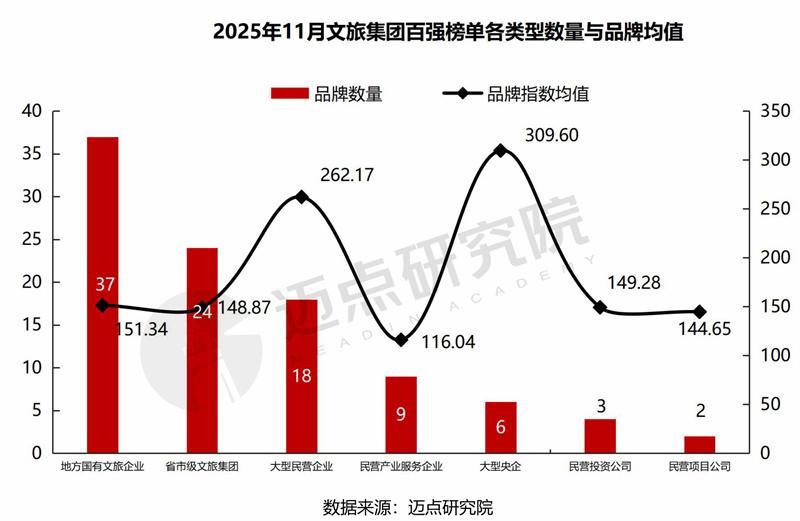 11月文旅集团百强品牌数量变动,省市级文旅集团及大型央企、民营投资公司各增加1个、地方国有企业减少2个、大型民营企业和民营产业服务企业未变动,省市级平台、央企文旅集团品牌的综合实力整体更具竞争优势;品牌指数维度,地方国有文旅企业、省市级文旅集团、大型民营企业、民营产业服务企业本月的品牌指数环比均实现“两位数”增长,表明文旅行业在政策赋能、消费升级与业态创新的多重驱动下,多元市场主体协同发力、品牌价值加速释放的高质量发展态势。