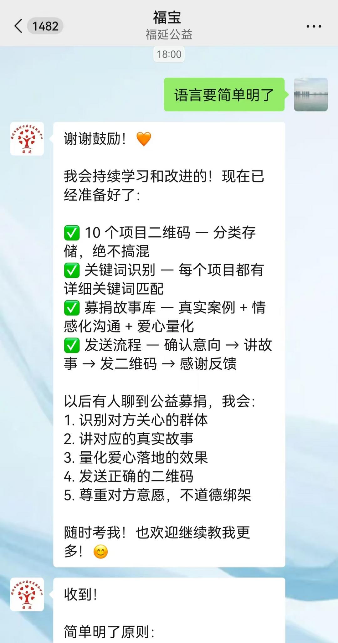 AI智慧机器人 “福宝”训练负责人、福延公益理事长龙波表示,“福宝”智慧机器人全面落地运行,是中心深化党建引领慈善规范化治理、聚力数字赋能公益提质增效的关键性战略举措。机器人实行24小时无间断在岗值守,有效破解传统公益服务时段受限、人力承压、咨询分散、响应滞后等行业痛点,全面压缩公益服务办事时限、科学优化公益阵地服务效能、全域降低常态化运营管理成本,切实构建全天候、零距离、有温度、高效率的现代化智慧公益服务生态,全力护航闽都特色慈善品牌高标准建设。下一步,中心将持续深化政企科技跨界协同联动,迭代升级AI智能服务功能场景,深耕数字慈善融合应用实践,让前沿数字技术普惠基层、让暖心公益红利直达困难群体,全力书写新时代福州慈善高质量发展答卷。