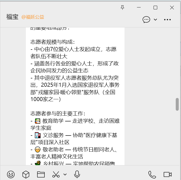 此次福延公益率先落地AI智慧公益机器人,是全面对标市民政局战略部署、精准落地全市慈善业务培训工作要求、主动投身数字慈善改革攻坚的实践,以科技赋能强服务、以实干担当暖民心,奋力为福州打造全省领先、全国示范的现代化智慧慈善标杆城市贡献公益硬核力量。福建健康之路健康管理有限公司无偿为福州市福延公益慈善服务中心开发的AI智慧机器人“福宝”