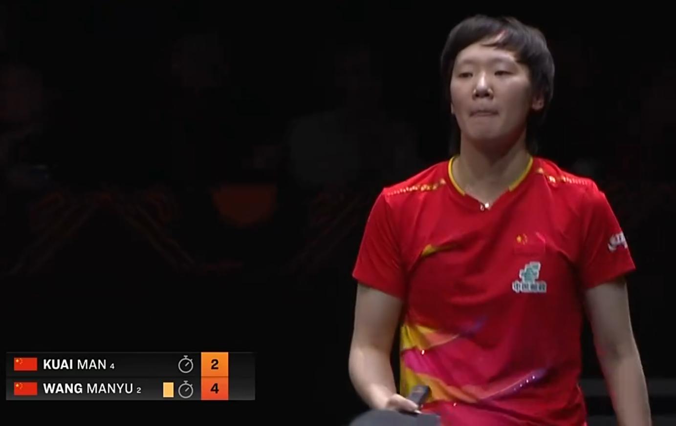 第四局,蒯曼在开局0-3落后的情况下叫暂停;暂停回来后,蒯曼打破了得分荒,在追到3-5后王曼昱也叫暂停。再次暂停回来后,王曼昱稳住了局势取得8-4的领先;顽强的蒯曼随后又利用正手快带连拿3分追到8-7;关键时刻王曼昱又顶住了冲击,最终是以11-8再赢一局。大比分上,王曼昱3-1领先。