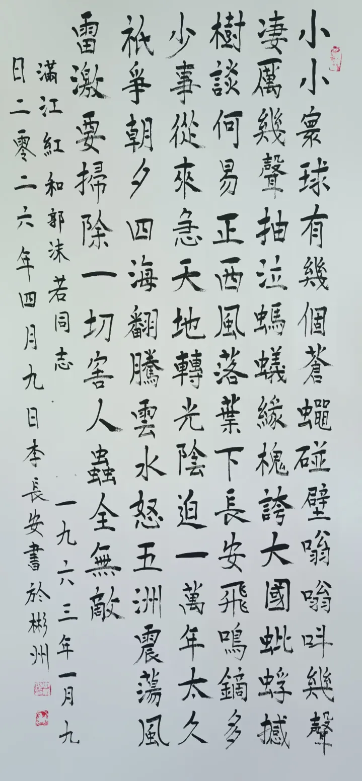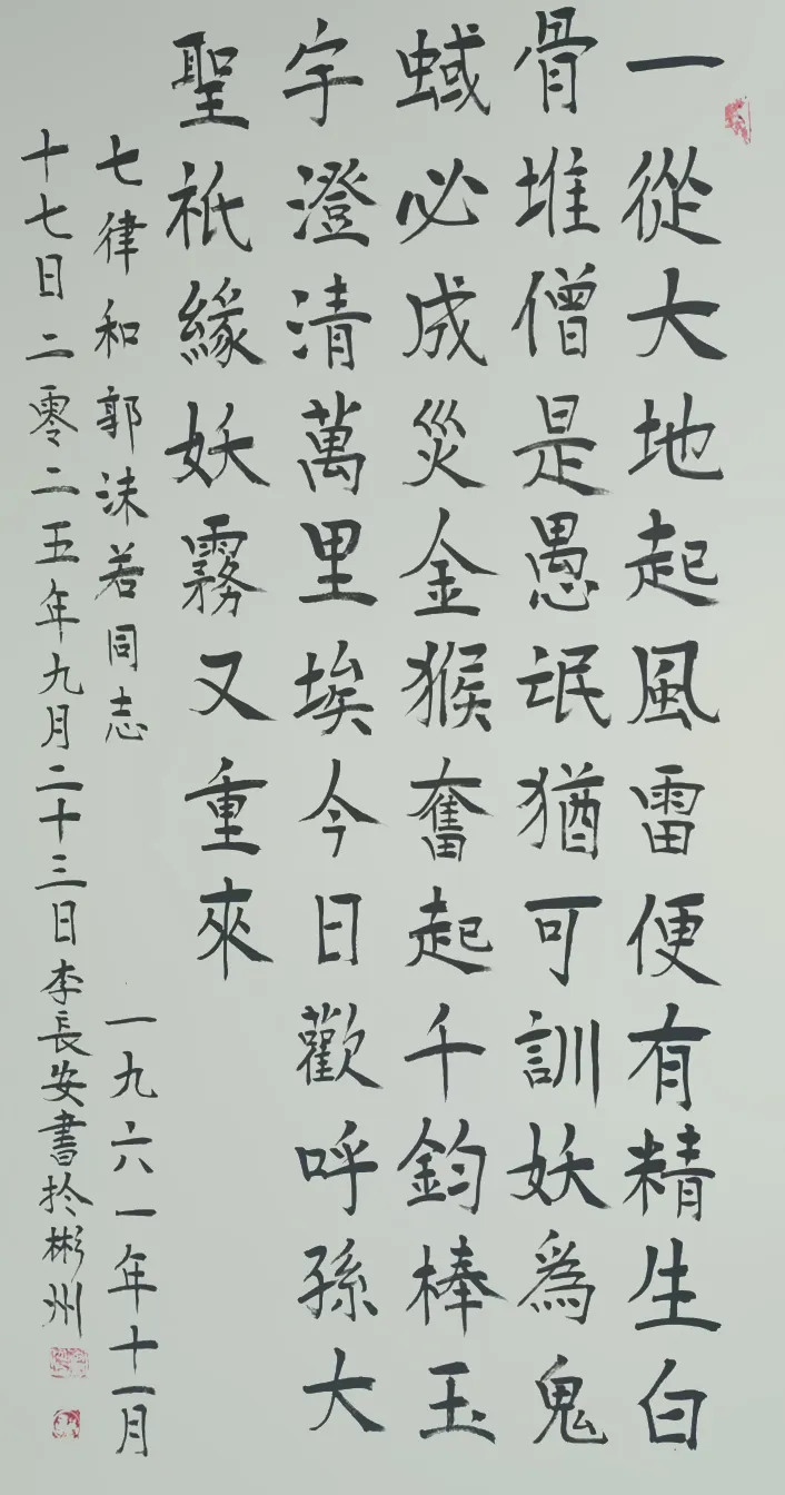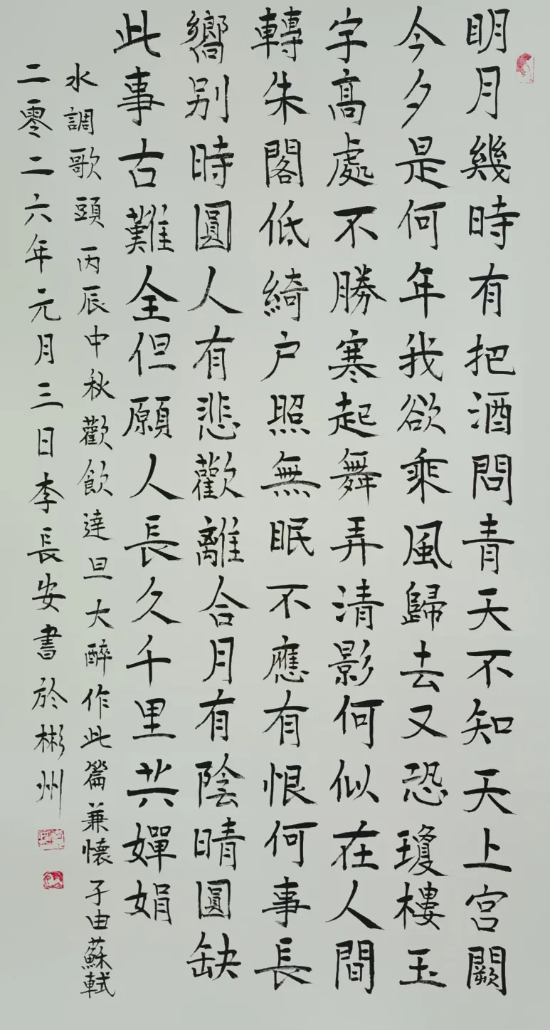 李长安,男,生于1950年,住陕西省咸阳市彬州市太峪镇街道。在大集体時期,在几个大工程,如水电站、梅七线、治理太峪河,先后曾任公社连部、营部、治河指挥部技术员兼保管员。84年后、曾任彬县个体协会太峪分会主席、主任、会长30余年。86年曾出席陕西省召开的私营企业、先进个体劳动者表彰大会,会后省委书记张勃兴和代表们一起合影留念现在他还保存着那张珍贵的黑白照片。现在是彬州市书画协会会员,咸阳市老年书画协会会员,陕西省老年书画诗词协会会员,中国书画家协会会员。中华人民共和国一級书法师、国粹艺术名家,走向世界国礼艺术家,文化强国2025百强艺术家。ccTV签约艺术家,中华艺坛著名书法家,2026中华艺坛五杰。