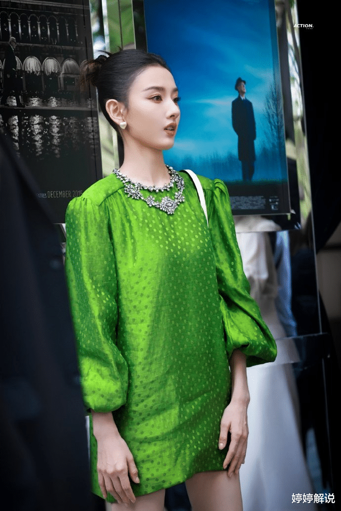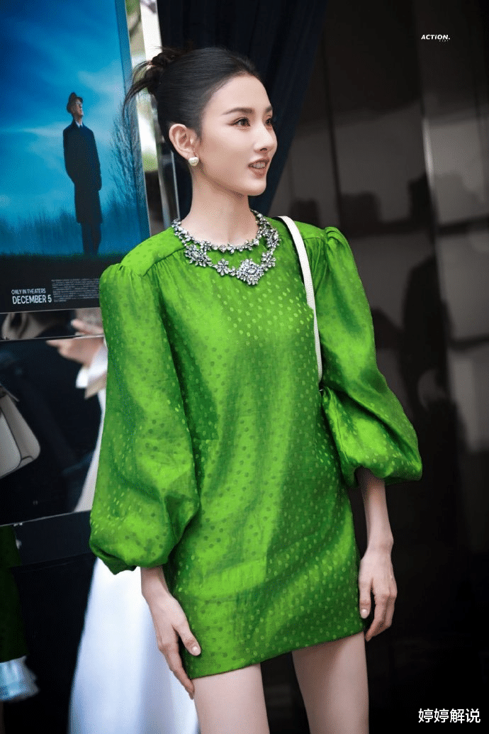 尤其是那抹绿色,不是扎眼的荧光绿,也不是沉闷的墨绿,而是一种带着水润感的淡绿,衬得她皮肤更加白皙透亮。配合着微微卷曲的长发和精致的妆容,整个人看起来就像是女娲精心雕琢的作品,五官、气质、造型全部在线,几乎没有可以挑剔的地方。