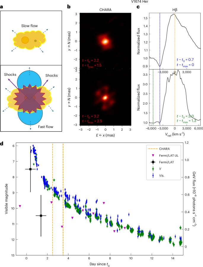 新星V1674的早期成像。Her显示出球对称性与潜在多重流出的转变。图:自然天文学