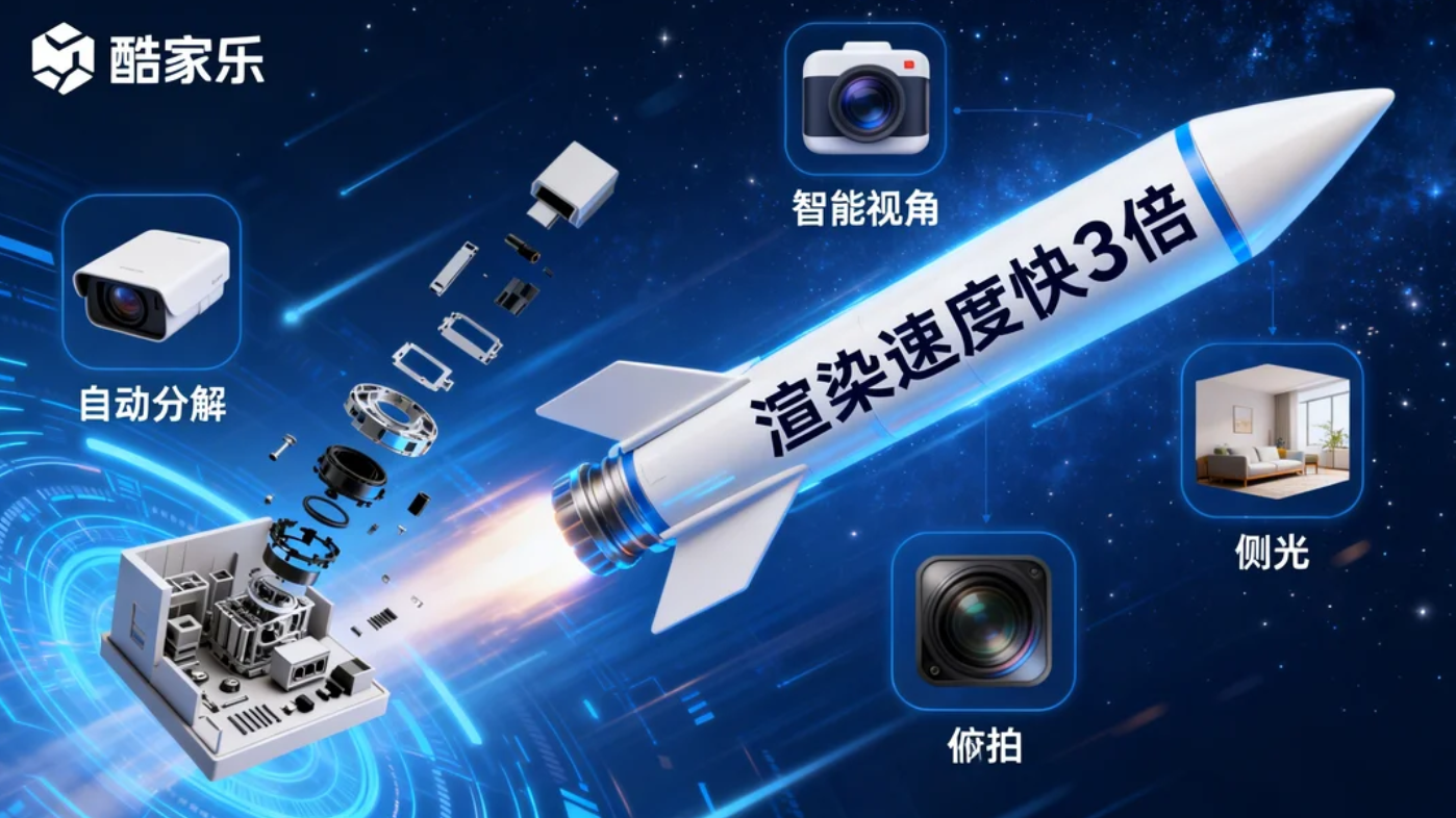 速度这块,酷家乐绝对是“卷王”!自研云端渲染引擎,1-4K图1-3分钟出,8K也才5分钟,比传统软件快几十倍。每个影棚还有预设智能视角,多选角度一键出图,不用自己调相机参数;爆炸图、安装动画模板更是神操作——选好模型点“推散”功能,3步就能生成视频(选模型→调推散→渲染),连K帧都不用手动做,设计师效率直接翻倍!