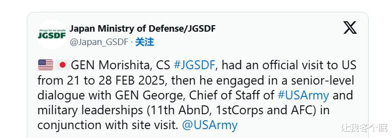 日本陆自在上月月底的时候访问了美国,和美国的陆军代表进行了会面,参观了美国陆军第一军,而该军是美国部署在印太地区陆军力量的司令部。美国陆军向日本代表展示了两款导弹,其中一款是暗鹰计划中的美陆军高超音速导弹。随后,日本就在X上发布照片,展示了其在美国参观导弹的场景,称和美国就印太地区的局势交换了“战略见解”,提出日自会加强与美国陆军的合作,作为战略联盟确保双方的共同利益。