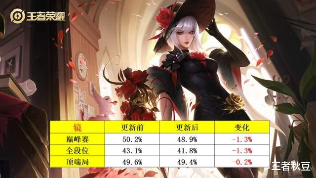 受此影响,镜的三榜胜率全都下降,巅峰赛和顶端局胜率下降1.3%,顶端局下降0.2%。镜的大盘全段位胜率来到了可怜的41.8%,虽然说镜的上限很高,但是41.8%胜率的全段位胜率说明已经不适合大部分玩家使用的,建议要么加强,要么重做。