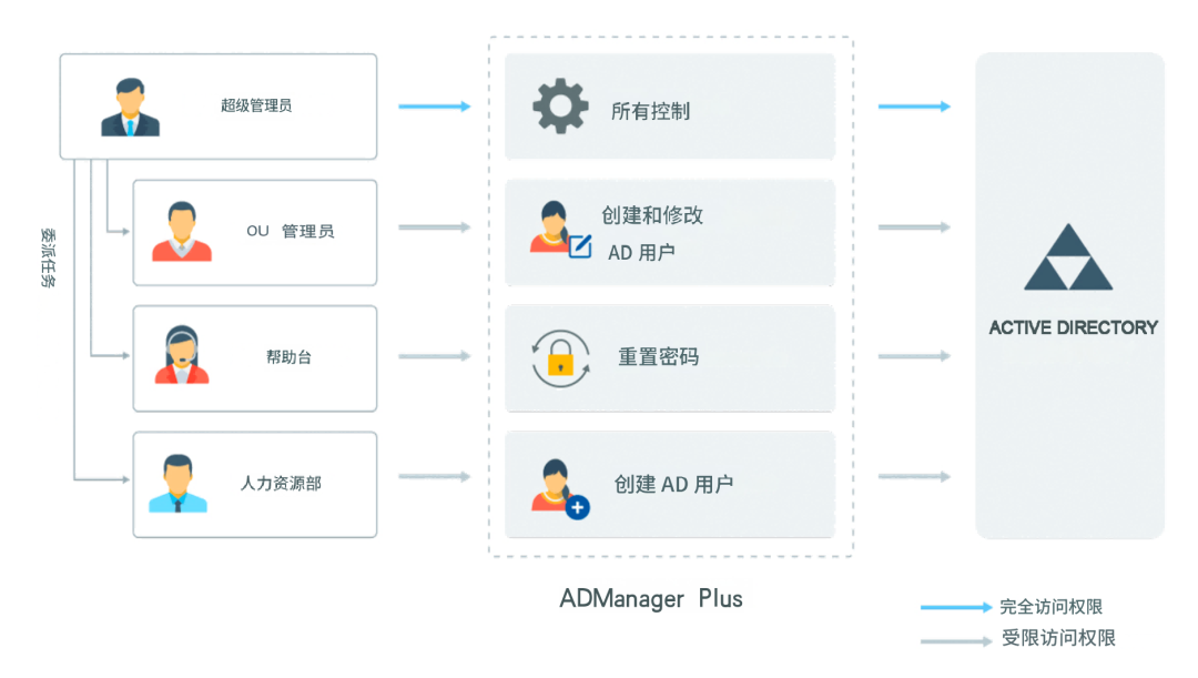 AD 委派与审批流程:部署审批流程,所有访问权限申请、用户账号创建及修改请求均需审核批准后执行,避免未经授权的变更;将重复性请求(如学生密码重置、账号解锁、用户信息修改,教师和工作人员的用户组成员身份授予、文件夹访问权限申请)委派给相应人员处理,减轻 IT 团队负担。