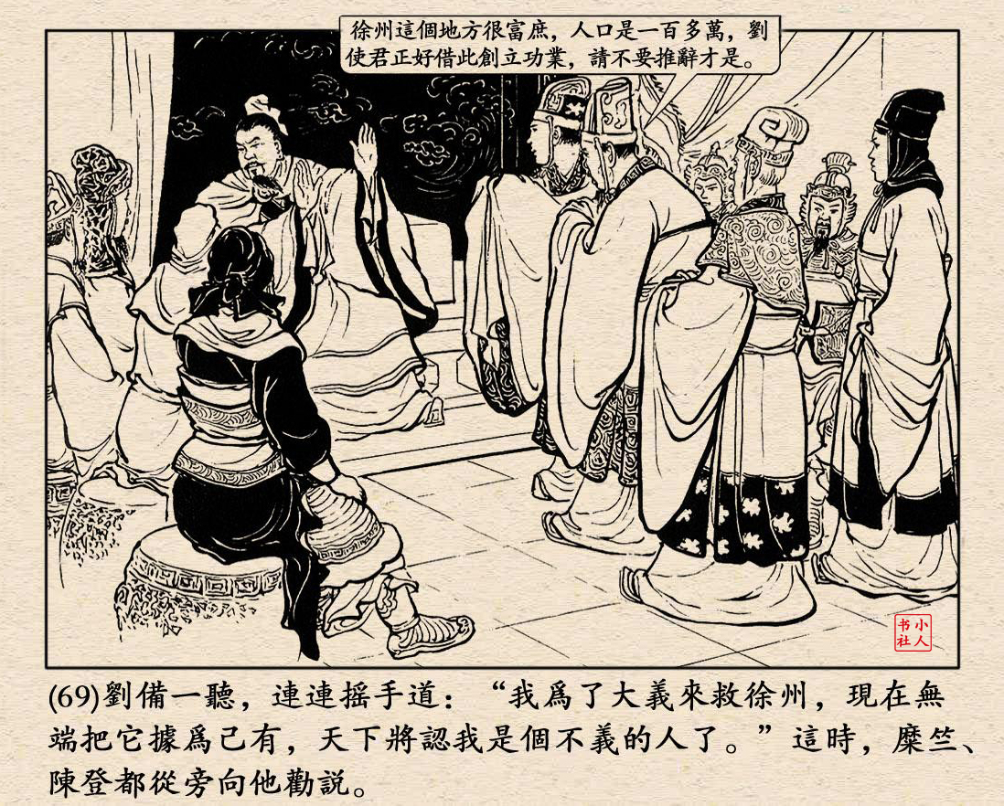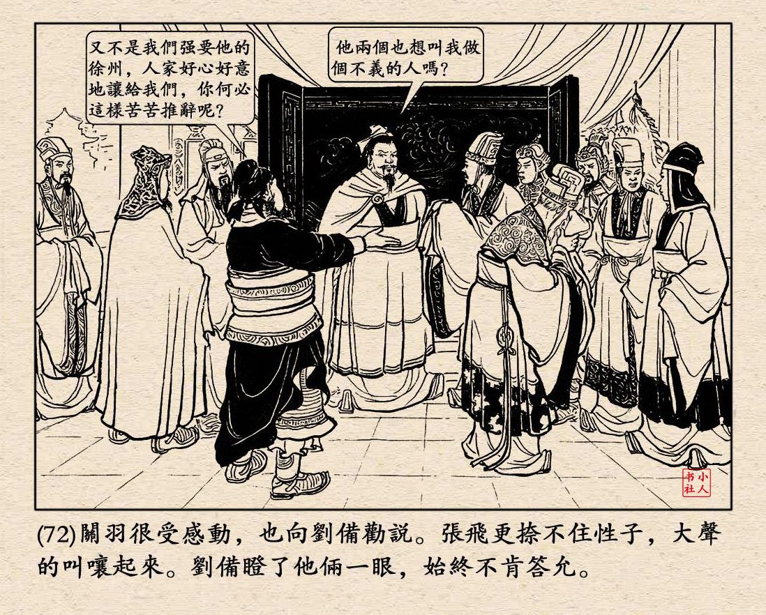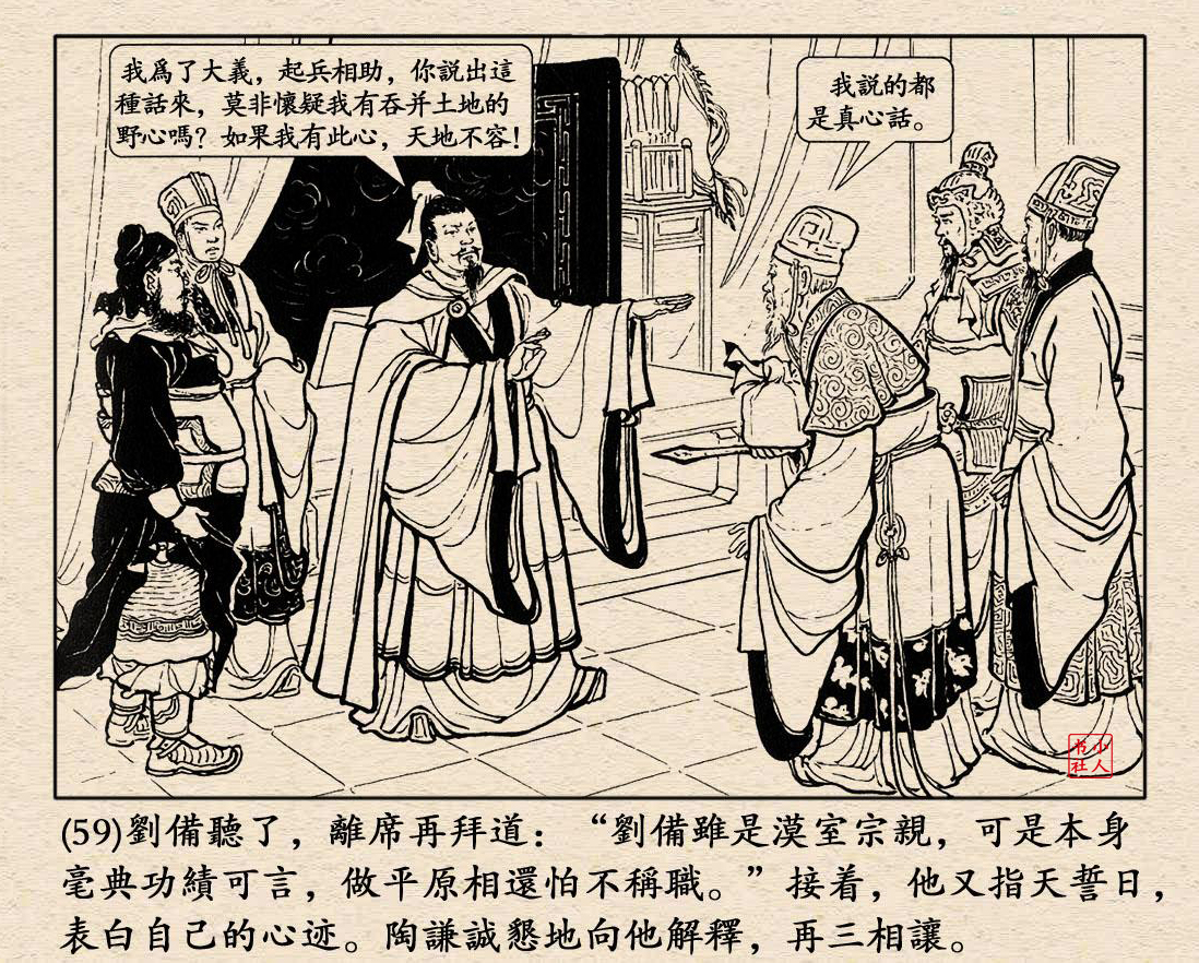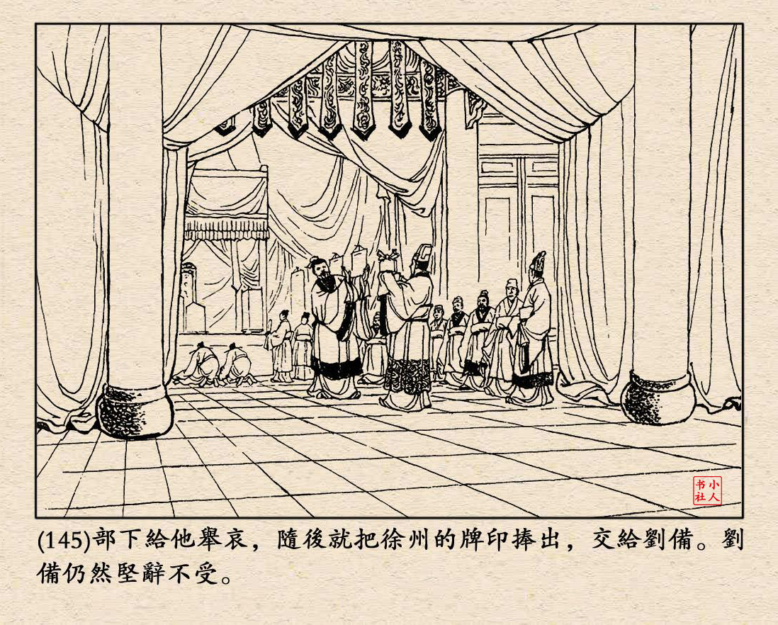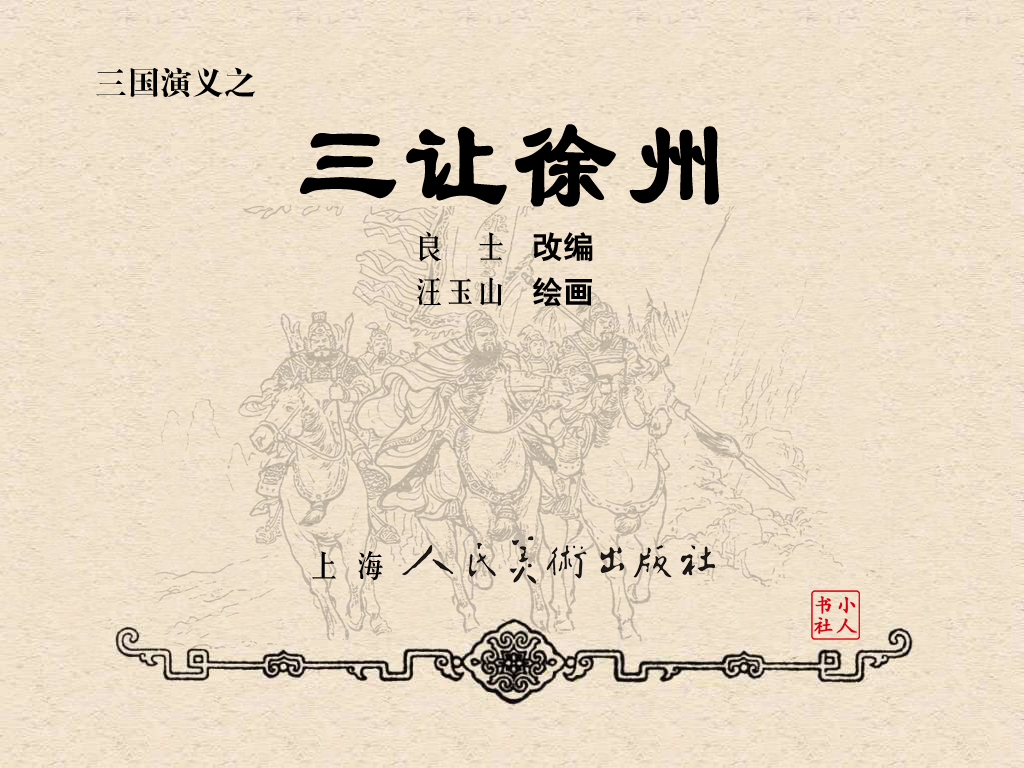 《三让徐州》连环画是由良士改编,汪玉山绘画。故事讲述曹操进攻徐州太守陶谦,刘备救徐州,代陶谦求情。曹操因吕布袭了兖州、汉阳,乘机回兵战吕布,被吕布火攻所破。附近谦年老,三次要让刘备管领徐州,刘备不受,直到陶谦病故,才遵遗言权为徐州太守。