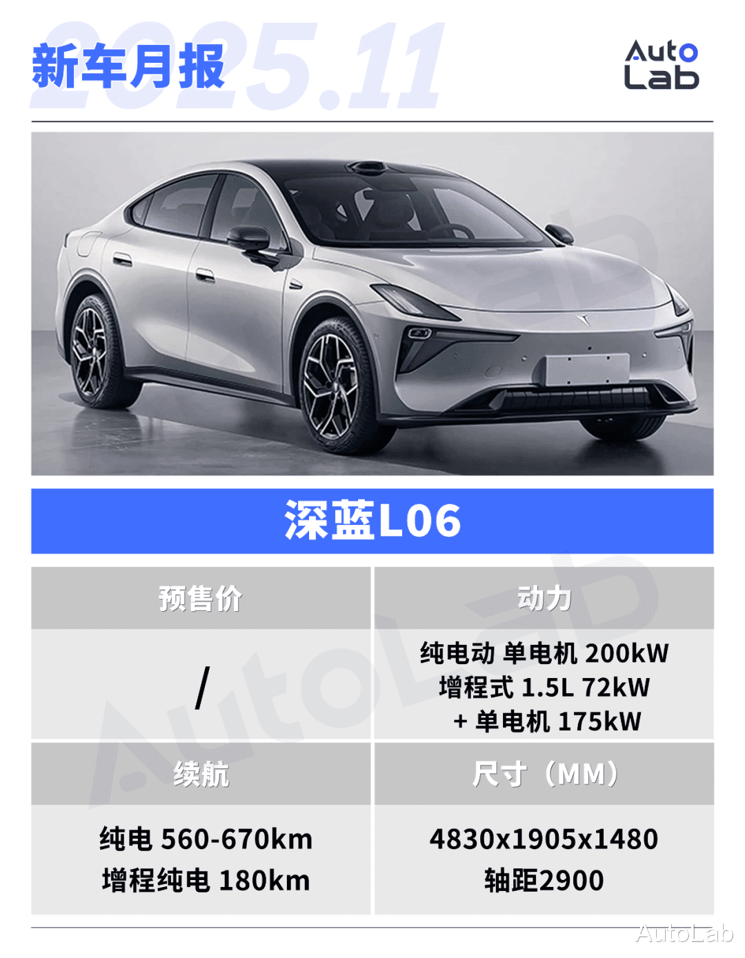 深蓝L06定位中型轿车,提供增程和纯电动力可选。