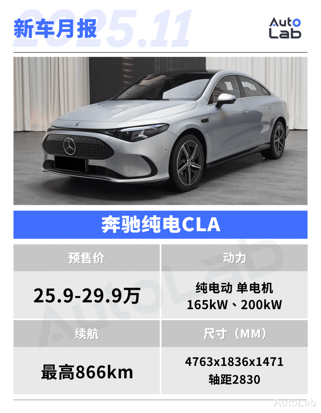 纯电CLA是奔驰MMA纯电平台的首发车型,按照此前官方透露的信息,它将搭载85kWh电池和两挡变速箱,整车百公里电耗仅10.9kWh,续航可达866km。