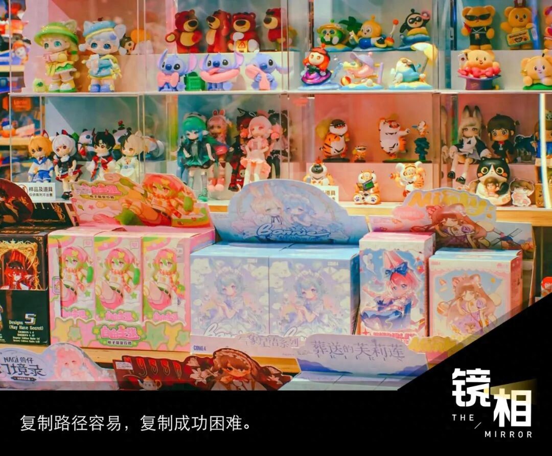 店里摆着一排相似的玩具,竖耳朵、皱眉头,远看几乎一个样。有人故意做得更像一些——对只听说过Labubu的人来说,很容易认错。杨瑞2021年入行潮玩,在头部潮玩公司工作三年,为了摸清市场、贴近消费者,养成了去一线巡店的习惯,看遍了各种Labubu仿款。他发现,Labubu爆火后的这一年,这样的玩具越来越多。