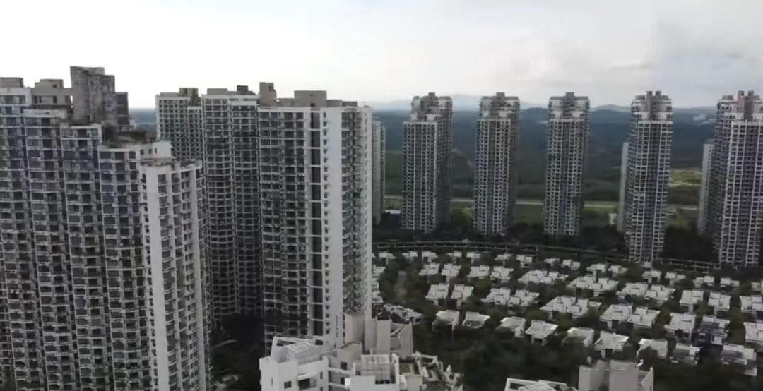 你看那栋裹满绿植的高楼,当年宣传是 “住在森林里”,现在藤蔓都快爬进阳台了,阳台门大敞着,里面空空荡荡,连张椅子都没有。还有那片靠海的别墅区,屋顶的白漆都晒脱皮了,院子里的泳池积了半池雨水,看着都泛凉。