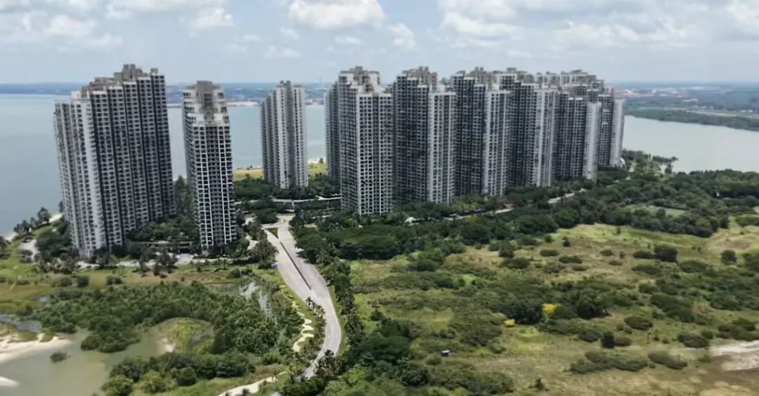 航拍图里密密麻麻的高楼占了小半个岛,玻璃擦得锃亮,可窗户全黑着,连个亮灯的都没几户。之前刷到个实拍视频:博主走在小区里,路边的草长得快没过脚踝,配套的商业街卷帘门全拉着,唯一的动静是海风刮过绿植的声音,走了20分钟,别说人了,连只流浪猫都没见着。