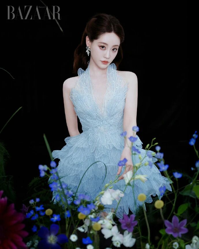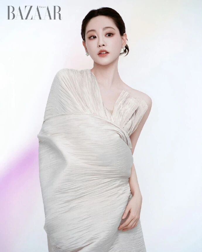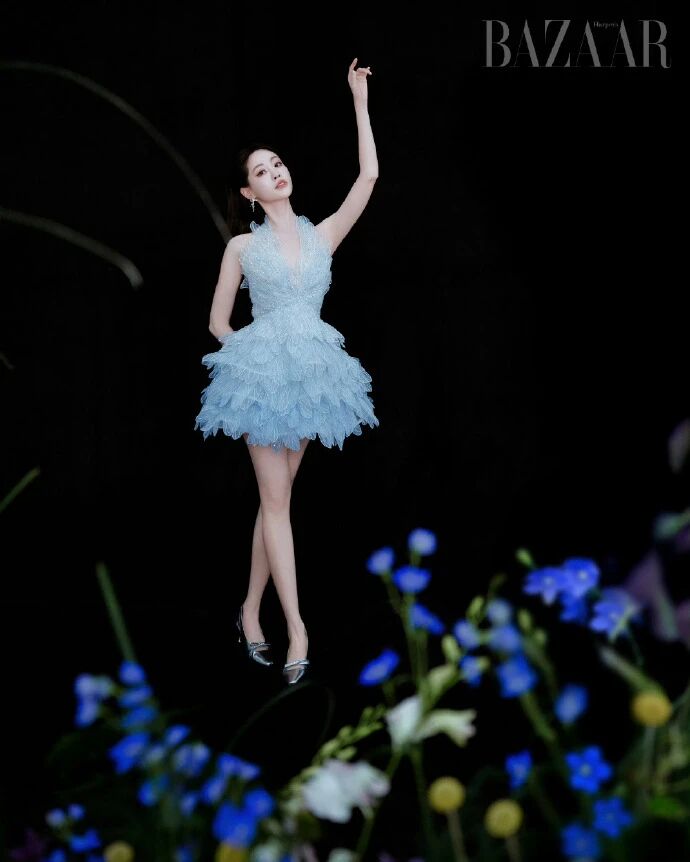 :浅纱裙的垂褶顺着腰棱的柔弧铺,单肩设计露锁骨的润,把 “复古的柔” 揉成 “魂的明”;蓝色纱裙的轻透衬着骨相的灵,让 “明媚” 不是甜腻,是 “骨相撑起来的复古活”。金句:“封面的高级从不是风格堆量,是冷御贴骨的锐,复古裹魂的柔 —— 祝绪丹这波,是把双韵穿成了自己的骨相标签”。