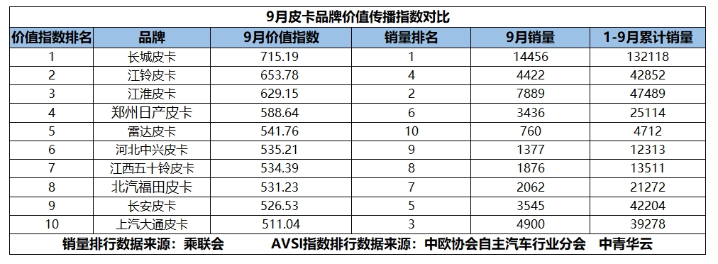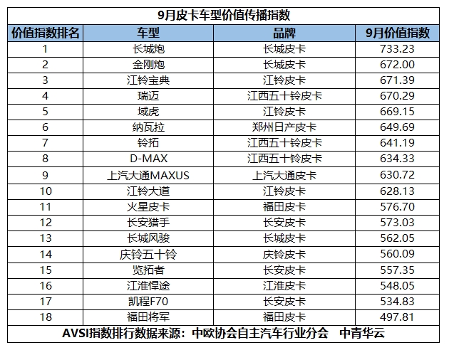 另据9月皮卡品牌价值传播指数排行显示,长城皮卡同样排在首位,指数值为715.19;第二位是江铃皮卡,指数值是653.78;第三位是江淮皮卡,指数值是629.15。其后依次是郑州日产皮卡、雷达皮卡、河北中兴皮卡、江西五十铃皮卡、北汽福田皮卡、长安皮卡、上汽大通皮卡。