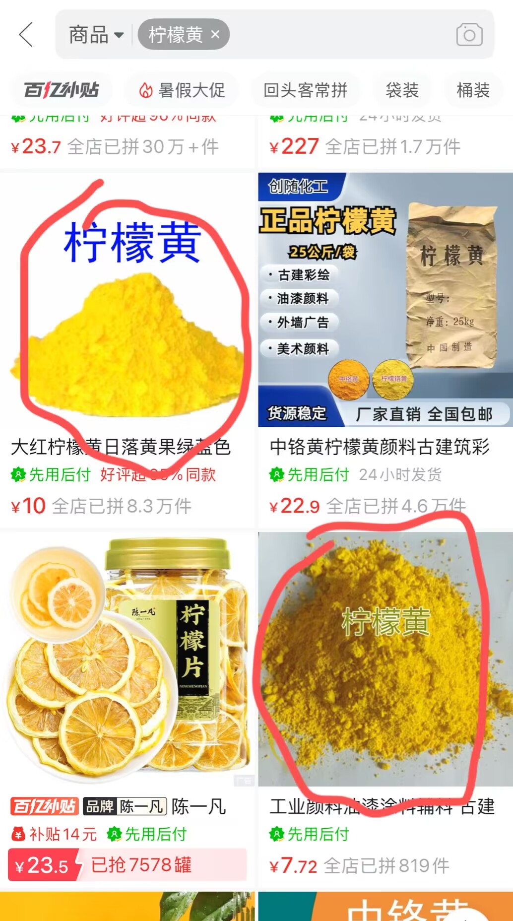 另一群友在某网购平台搜了一下柠檬黄,结果里同时出现了食品用的和工业用的柠檬黄……