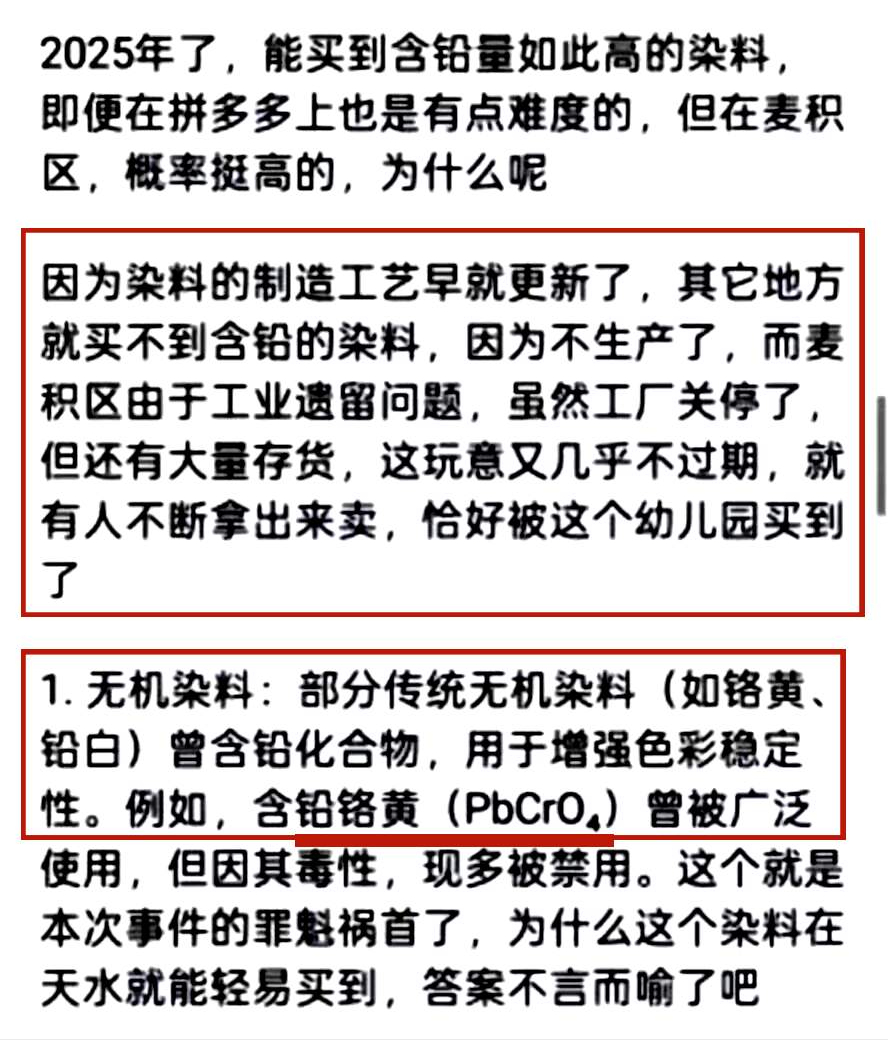 【通报】《关于天水市麦积区培心幼儿园幼儿血铅异常问题调查处置情况的通报》发布后 ,在网上引起的激烈讨论,网友纷纷提出质疑,有科普大V指出重大疑点,是通报中关于【溯源调查情况】的描述,当中提到“培心幼儿园2份样本检验不合格...两份留样铅含量分别为1052毫克/千克、1340毫克/千克”,后面指出“该园后厨人员通过网络平台购买彩绘颜料,稀释后用于部分食品制作。”