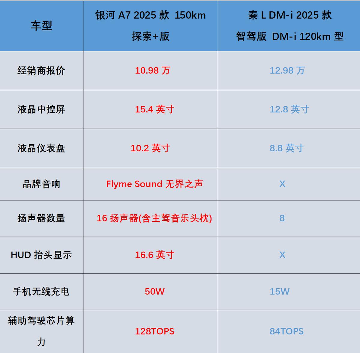 从经商商的报价来看,银河A7的价格比秦L DM-i便宜2万左右,可以说这两个版本,银河A7的价格优势还是比较明显的,那这两个版本产品力到底谁输谁赢?